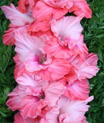 Гладиолус "Малика" представляет собой мощный сорт с яркими лососево-розовыми цветами, украшенными размытым насыщенно-малиновым пятном на нижних лепестках. Края лепестков имеют более интенсивную розовую окраску, что придает цветам особую выразительность. Лепестки отличаются плотной фактурой, а крепкий и прочный колос может нести до 20 бутонов, из которых одновременно раскрываются до 9 цветов. Изящность и уникальная окраска бутонов делают этот сорт идеальным для срезки.