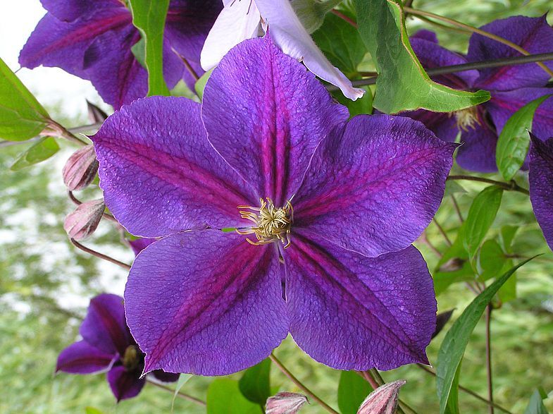 Клематис "Индийская Звезда" - это великолепный сорт, который радует обильным цветением и крупными фиолетовыми цветками с пурпурной полосой и бежевыми пыльниками. Этот сорт прекрасно подходит для различных мест выращивания, особенно для высоких опор, ограждений и светлых фонов, где он создает эффектную цветочную маскировку для садовых строений и заборов.